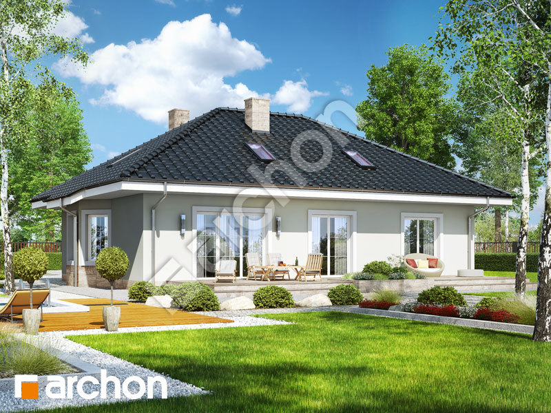 Wygodny dom parterowy o klasycznej bryle, którego program funkcjonalny został wzbogacony obszernym strychem z możliwością adaptacji w drugim etapie. Charakter małego dworku podkreśla interesujące zadaszenie wejścia. Jasny tynk doskonale prezentuje się z pokrytym antracytową dachówką, czterospadowym dachem. Tradycyjny styl projektu podkreślają zastosowane opaski wokół okien ze szprosami. Projekt elewacji dopełnia cokół w piaskowym kolorze. Część dzienna to przestronny i jasny salon z miejscem na narożną kanapę, dwa fotele i stolik kawowy oraz pięknie doświetlona jadalnia umieszczona w przeszklonym wykuszu. Strefa wypoczynkowa z bezpośrednim wyjściem na taras posiada miejsce przeznaczone na kino domowe oraz kominek, który dociepla wnętrze i wprowadza do niego przytulny klimat w chłodne wieczory. Z jadalnią sąsiaduje funkcjonalnie zaprojektowana kuchnia z oknem, przy którym zaaranżowano strefę do zmywania. Zaletą tej otwartej kuchni jest duża ilość blatów roboczych oraz wygodny barek śniadaniowy. Jej program został uzupełniony praktyczną spiżarnią, ułatwiającą przechowywanie produktów i utrzymanie porządku. Z holu domu dostępna jest niewielka toaleta oraz użyteczny schowek zlokalizowany pod schodami. Strefa prywatna mieszkańców to trzy wygodne, ustawne i jasne pokoje z dużą ilością miejsca do przechowywania. Ogólnodostępna łazienka z oknem posiada pełny program funkcji: wannę, prysznic, toaletę, umywalkę i dodatkowo miejsce na ustawienie pralki. Z wiatrołapu dostępna jest kotłownia na paliwo stałe. Zaletą projektu jest ocieplony strych z możliwością adaptacji w kolejnym etapie, na którym można zaaranżować dodatkowe pokoje, strefę relaksu czy domową siłownię. Prezentowany “Dom pod jarząbem 12” należy do kategorii: projekty domów tradycyjnych, projekty domów parterowych oraz projekty małych domów.