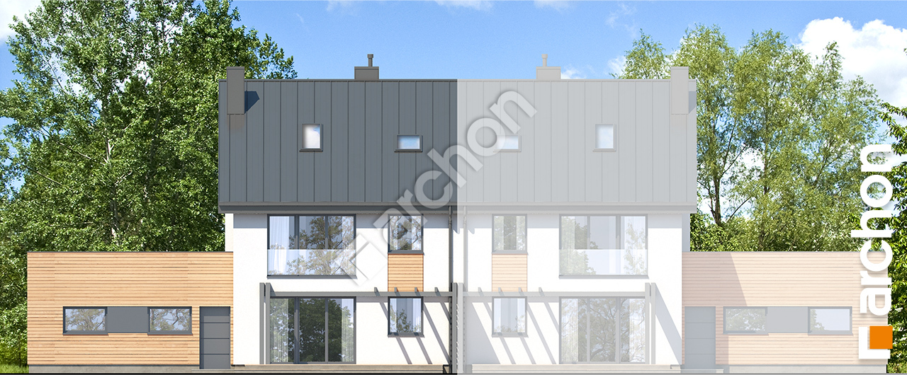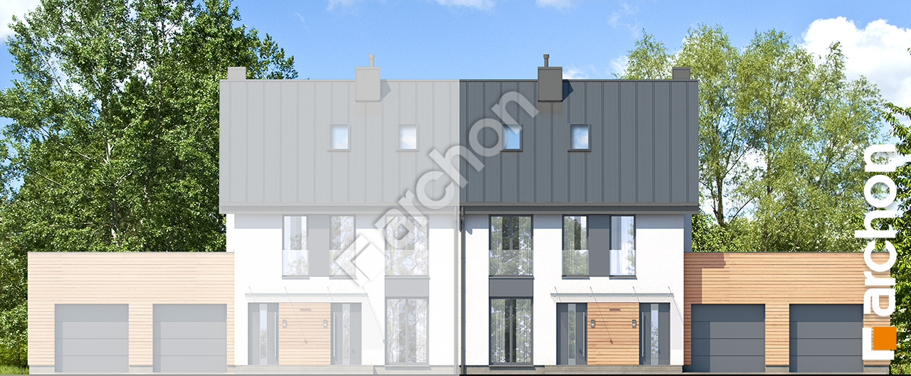 pobierz obrys budynkuProjekt nowoczesnego domu dwurodzinnego do zabudowy bliźniaczej, który bardzo dobrze sprawdzi się w realizacjach deweloperskich. Daje możliwość zwiększenia intensywności zabudowy na terenach przeznaczonych pod budownictwo jednorodzinne. Piękny wygląd elewacji to zasługa starannej kompozycji materiałów wykończeniowych. Z jasnym tynkiem wspaniale koresponduje stolarka i dach w kolorze grafitowym. Naturalnego uroku dodaje drewniana okładzina, którą zaakcentowano strefy wejściowe i zlokalizowane przy bocznej elewacji garaże. W każdym segmencie zaprojektowano dwa trzypokojowe lokale mieszkalne, mieszczące się na osobnych kondygnacjach z indywidualną komunikacją. Do każdego przynależy jednostanowiskowy garaż. W układzie funkcjonalnym mieszkań przewidziano otwartą strefę dzienną, obejmującą wygodny salon z narożną sofą oraz kuchnię z miejscem na część jadalnianą. Dwie sypialnie to pomieszczenia prywatne, pomiędzy nimi zaprojektowano łazienkę. W różnych częściach mieszkań przewidziano miejsca na praktyczne szafy ułatwiające przechowywanie. Atutem projektu, który z pewnością docenią użytkownicy, jest przemyślana lokalizacja stref tarasowych, gwarantująca im maksimum prywatności podczas relaksu na świeżym powietrzu. Z lokalu na parterze taras dostępny jest z salonu, a mieszkańcy lokalu na poddaszu mają do dyspozycji obszerny taras nad garażami, a więc zlokalizowany przy innej ścianie budynku. „Dom w bratkach 15 (R2B)” to reprezentant kolekcji: projekty domów nowoczesnych, projekty domów dwurodzinnych, projekty domów do zabudowy bliźniaczej, projekty domów z poddaszem użytkowym.