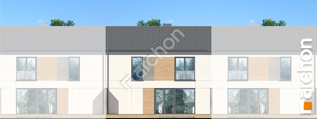 pobierz obrys budynkuNowoczesny dom z poddaszem użytkowym i jednostanowiskowym garażem do zabudowy szeregowej, idealna propozycja do realizacji atrakcyjnych inwestycji deweloperskich. Elewacja pokryta jasnym tynkiem łączy płaszczyzny drewnianej okładziny ze strukturą betonu i doskonale komponuje się ze stolarką i dachówką w kolorze antracytu. Strefa wejściowa i wjazd do garażu usytuowane zostały w podcieniu, który zaakcentowano nowoczesną ramą. Wiatrołap został wymknięty od części mieszkalnej parteru, przewidziano w nim miejsce na pojemną szafę. W otwartej strefie dziennej mamy do dyspozycji salon połączony z częścią jadalnianą. Narożna sofa zapewnia wygodne miejsce relaksu, a obiadowy stół pozwoli całej rodzinie celebrować wspólne posiłki. Salon doświetlony dużymi przeszkleniami połączony jest z tarasem i ogrodem stanowiącymi strefę relaksu na świeżym powietrzu. Otwarta kuchnia, doświetlona frontowym oknem, posiada funkcjonalną zabudowę z obszernymi blatami roboczymi, co gwarantuje optymalne warunki do pracy. Na parterze zaprojektowano też łazienkę, a przez wiatrołap dostępny jest garaż. Schody do strefy prywatnej na poddaszu domu, zlokalizowane obok tarasu, zapewniają łatwość przemieszczania się i korzystania z tarasu oraz ogrodu. Przestronny hol strefy prywatnej łączy trzy sypialnie z naturalnie doświetloną wygodną ogólnodostępną łazienką z miejscem na wannę, prysznic oraz pralkę. Pokoje na poddaszu są ustawne i przestronne, wysoka ścianka kolankowa pozwala na dobre ich doświetlenie wysokimi nowoczesnymi portfenetrami. „Dom w bukszpanach 2 (GS)” należy do kategorii: projekty domów nowoczesnych, projekty domów z poddaszem użytkowym, projekty domów z dachem dwuspadowym, projekty domów z garażem jednostanowiskowym, projekty domów do zabudowy szeregowej, projekty domów dla deweloperów.