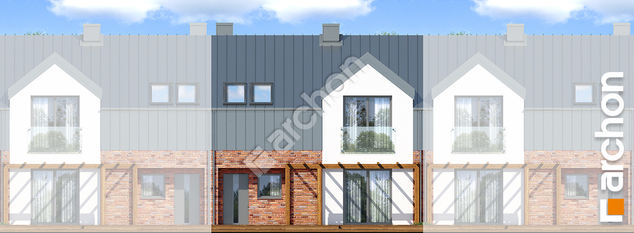 pobierz obrys budynkuTo kolejny projekt z rodziny „Domów w gunnerach”, należący do kategorii: projekty domów szeregowych, dzięki niewielkiej szerokości segmentu idealnie nada się na wąską działkę. Nowoczesny wygląd domu podkreśla wykończenie elewacji, szczególnie efektownie prezentuje się ceglana okładzina zestawiona z jasnym tynkiem. Dopełnieniem całości jest charakterystyczny dach bez okapów, który pokryto blachą łączoną na rąbek. Ozdobą strefy frontowej jest ryzalit, a w jego podcieniu zaprojektowano praktycznie zadaszone wejście do domu. Mieszkańcy „Domu w gunnerach (SA)” mają do dyspozycji atrakcyjną strefę tarasową, jedną z możliwości jej aranżacji jest drewnianej pergola. Wygodę użytkową zapewnia sprawdzony układ funkcjonalny, w którym salon, część jadalna oraz kuchnia tworzą otwartą strefę dzienną. Dobrze rozplanowane funkcje kuchenne, możliwość zastosowania wysokiej zabudowy, duże okno zapewniają optymalne warunki podczas przygotowywania posiłków. Na parterze zaprojektowano także ogólnodostępną toaletę, a przez wiatrołap można szybko przejść do garażu. Posiada on również dodatkowe wejście od strony ogrodu. W staranie zorganizowanej strefie nocnej przewidziano trzy sypialnie, naturalnie doświetloną łazienkę oraz garderobę. Komfortowe użytkowanie poddasza zapewnia wysoka ścianka kolankowa oraz lukarny, dzięki nim pomieszczenia są bardziej ustawne i przestronne. Prezentowany projekt domu należy do kategorii: projekty domów z poddaszem użytkowym, projekty domów do zabudowy szeregowej, projekty małych domów, a także projekty domów na wąską działkę.