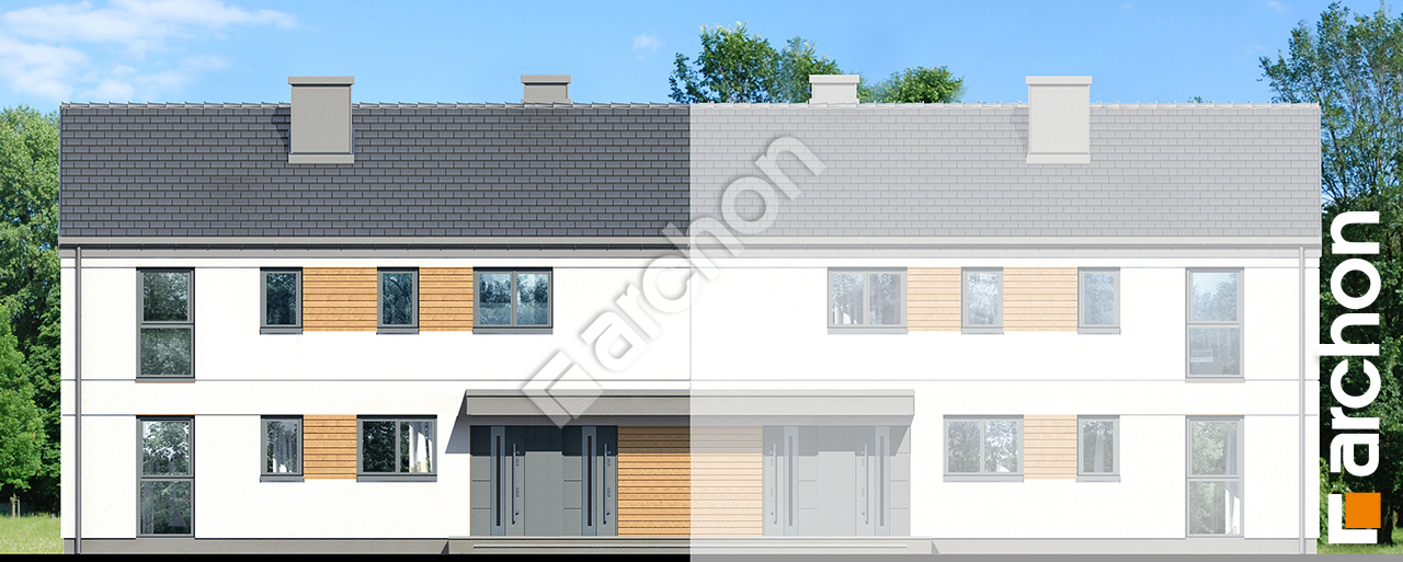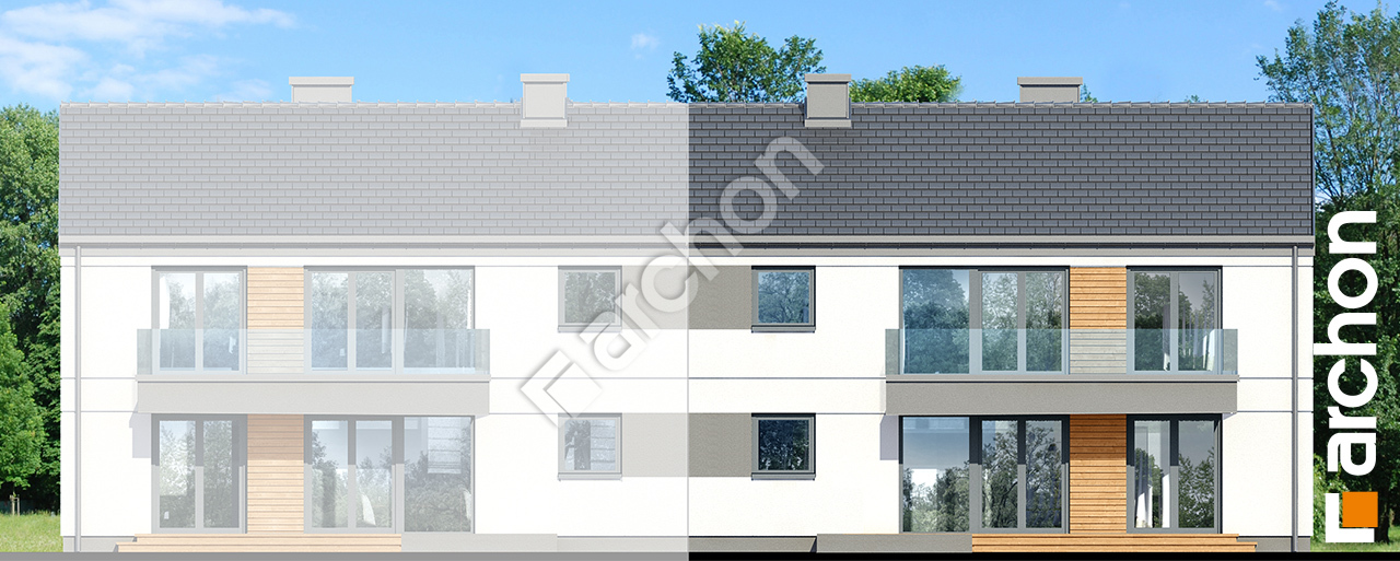 pobierz obrys budynkuProjekt domu Dom w halezjach 2 (R2B) to nowoczesna propozycja z kolekcji projekty domów, stworzona z myślą o deweloperach poszukujących inwestycji o wysokiej rentowności i sprawnej realizacji. Jest to dom dwurodzinny przeznaczony do zabudowy bliźniaczej, w którym mieszkania rozplanowano w układzie pionowym – jeden lokal znajduje się na parterze, a drugi na poddaszu użytkowym. Każdy z lokali posiada niezależne wejście, a mieszkańcy górnego mieszkania korzystają wyłącznie z przestronnej klatki schodowej, która pełni również funkcję praktycznego miejsca do przechowywania większych przedmiotów. Atutem projektu jest atrakcyjny program funkcjonalny zaplanowany na optymalnej powierzchni, obejmujący w każdym z mieszkań o powierzchniach 72 i 76 m2: 3 sypialnie, łazienkę, toaletę, a także komfortową, przestronną strefę dzienną z kuchnią wyposażoną w duży półwysep. Każde mieszkanie zyskuje dodatkową przestrzeń rekreacyjną dzięki balkonowi lub tarasowi, co podnosi wartość oferty w oczach przyszłych nabywców. Nowoczesna, elegancka bryła budynku została podkreślona dwuspadowym dachem bez okapów, co nadaje całości minimalistyczny i prestiżowy charakter. W projekcie domu zastosowano rozwiązania zapewniające wysoką izolacyjność akustyczną, co zwiększa komfort użytkowania lokali. Ogrzewanie oparto na ekonomicznych kotłach gazowych, co stanowi korzystne rozwiązanie zarówno dla dewelopera, jak i mieszkańców. Projekt domu doskonale sprawdzi się również na stosunkowo płytkich działkach, a jego prosta konstrukcja gwarantuje szybki proces budowy i pewność sprawnej sprzedaży inwestycji.