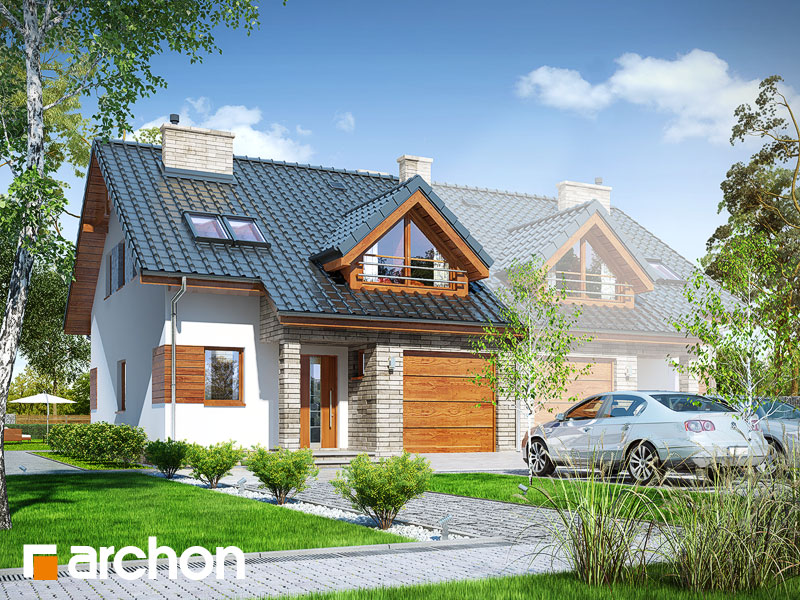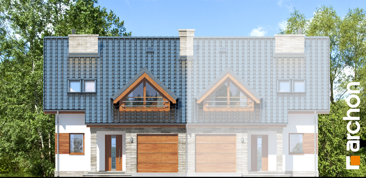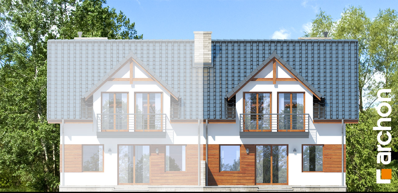 pobierz obrys budynkuInteresująca propozycja nowoczesnego projektu domu do zabudowy bliźniaczej, doskonale wpisującego się w wąskie działki. Stylowy charakter wykończenia domu opiera się na eleganckim połączeniu jasnego tynku z drewnianymi okładzinami elewacyjnymi oraz stolarką w tym samym kolorze. Wysunięcie garażu na elewacji frontowej pozwoliło na stworzenie praktycznego zadaszenia nad wejściem głównym. Liczne przeszklenia pięknie doświetlają wnętrze oraz płynnie łączą dom z otaczającym go ogrodem.