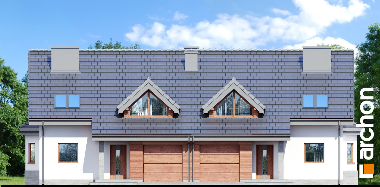 pobierz obrys budynkuBardzo funkcjonalny projekt domu dwurodzinnego (jednorodzinny dwulokalowy), o prostej bryle przykrytej dachem dwuspadowym. Wysunięcie garażu na elewacji frontowej pozwoliło stworzyć praktyczne zadaszenie wejścia głównego, chroniącego przed wiatrem i opadami. Klasyczny styl wykończenia elewacji podkreśla klinkierowa podmurówka oraz opaski wokół drewnianej stolarki. Liczne przeszklenia naturalnie doświetlają wnętrze, łącząc je płynnie z otaczającym dom ogrodem.