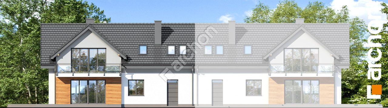 pobierz obrys budynkuTo propozycja z popularnej rodziny projektów „Domów w malinówkach”, polecana Inwestorom zainteresowanym budową nowoczesnego i funkcjonalnego bliźniaka. Budynek zwraca uwagę ciekawym wykończeniem elewacji, zastosowana kolorystyka sprawia, że bryła zyskała atrakcyjny wygląd, drewniane okładziny dodają jej naturalnego wyrazu. Każdy segment oferuje starannie zorganizowany program użytkowy, optymalnie dostosowany do różnych potrzeb domowników. Wiatrołap w praktyczny sposób oddziela część mieszkalną od zaplecza gospodarczego, które w prezentowanym projekcie tworzy jednostanowiskowy garaż i kotłownia gazowa. Część dzienna parteru to jest doskonale doświetlona, przeszklenie tarasowe zapewnia szerokie otwarcie na widok zewnętrzny. Ciekawie zaaranżowano strefę rekreacyjną na świeżym powietrzu, okalający dwie ściany domu taras pozwoli na relaks w promieniach słońca o różnej porze dnia. Przestrzeń wypoczynkowa salonu płynnie łączy się z jadalnią, a ta bezpośrednio sąsiaduje z kuchnią. Zaproponowany program użytkowy strefy kuchennej wyróżnia się starannie przemyślaną organizacją poszczególnych funkcji, zapewnia wygodną pracę dla dwóch osób. Atutem „Domu w malinówkach 5 (B)” jest zaprojektowana na parterze strefa gościnna, którą tworzy pokój i sąsiadująca z nim łazienka. W części nocnej na poddaszu, w zaciszu trzech sypialni, mieszkańcy mają optymalne warunki do indywidualnego wypoczynku i pracy. Szczególnie atrakcyjnie prezentuje się sypialnia rodziców, której przestrzeń powiększa i otwiera na widok zewnętrzny duża lukarna z balkonem. Mamy tutaj dużą ilość miejsca, by zaaranżować strefę do czytania w wygodnymi fotelami, a także biurko do pracy lub toaletkę. Sypialnie główna dysponuje obszerną garderobą, w której system półek i drążków zapewni wygodne przechowywanie ubrań . Dopełnieniem układu funkcjonalnego części nocnej jest jasna łazienka oraz pralnia. „Dom w malinówkach 5 (B)” to bardzo interesująca propozycja z kolekcji: projekty domów do zabudowy bliźniaczej, należy także do kategorii: projekty domów małych, projekty domów z poddaszem użytkowym oraz projekty domów nowoczesnych.