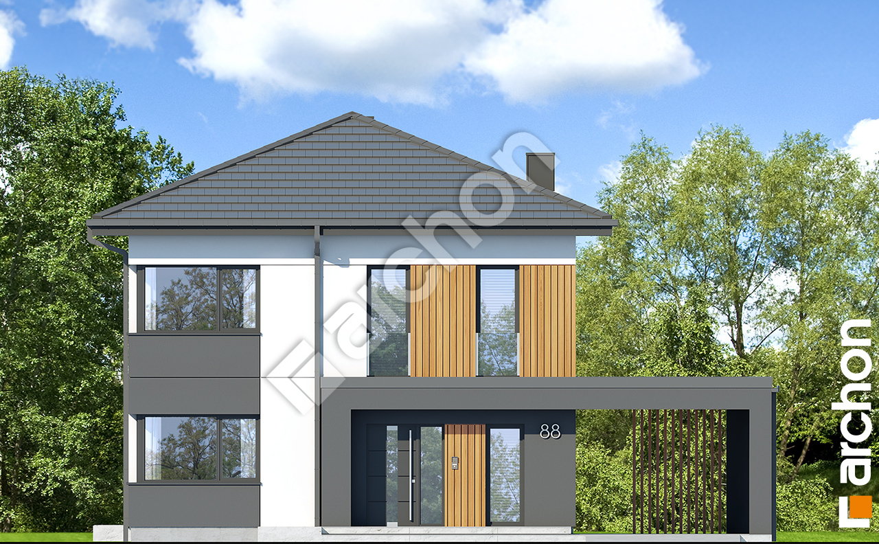 pobierz obrys budynkuProjekt domu Willa Gracja (E) to nowoczesny, piętrowy dom jednorodzinny z eleganckim dachem czterospadowym, który łączy reprezentacyjny wygląd z doskonale przemyślanym układem funkcjonalnym. Sercem domu jest przestronny salon o powierzchni powyżej 30 m², płynnie połączony z jadalnią i dużą kuchnią z komfortowym półwyspem dla minimum trzech osób, uzupełnioną o praktyczną spiżarnię dyskretnie zlokalizowaną pod schodami, co podnosi ergonomię codziennego użytkowania. Duże przeszklenia oraz efektowne okna narożne w kuchni i pokoju na piętrze zapewniają doskonałe doświetlenie wnętrz i podkreślają nowoczesny charakter bryły, a kominek w salonie tworzy przyjemną, domową atmosferę. Na parterze zaprojektowano dodatkowy pokój, który można zaaranżować jako gabinet, pokój gościnny lub sypialnię, natomiast na piętrze znajduje się komfortowa strefa nocna z pokojem rodziców wyposażonym w przestronną garderobę oraz balkon dostępny od strony tarasu. Dwie łazienki rozmieszczone na obu kondygnacjach, wydzielona pralnia oraz przewidziana w projekcie wentylacja mechaniczna z odzyskiem ciepła zwiększają funkcjonalność i standard domu. Projekty domów takie jak Willa Gracja (E) wyróżniają się dopracowanymi detalami, w tym nowoczesną, zadaszoną wiatą samochodową spójnie połączoną z budynkiem, czyniąc ten projekt domu atrakcyjną propozycją dla osób poszukujących stylu, przestrzeni i nowoczesnych rozwiązań.